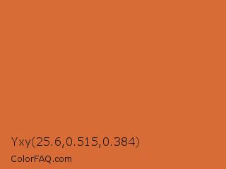 Yxy 25.6,0.515,0.384 Color is a normal orange color and the nearest color is Red Damask #da6a41. Hex code #d86c37 and RGB value is rgb(216,108,55). In RGB color space, this color is composed of 85% red, 42% green, 22% blue, In CMYK color space, this color is composed of 0% cyan, 50% magenta, 75% yellow , 15% black , In HSL color space, this color has a hue angle of 20° , 67% saturation and 53% lightness.