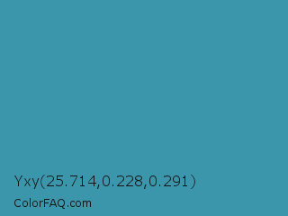 Yxy 25.714,0.228,0.291 Color is a normal cyan color and the nearest color is Boston Blue #3b91b4. Hex code #3c96ab and RGB value is rgb(60,150,171). In RGB color space, this color is composed of 24% red, 59% green, 67% blue, In CMYK color space, this color is composed of 65% cyan, 12% magenta, 0% yellow , 33% black , In HSL color space, this color has a hue angle of 191° , 48% saturation and 45% lightness.