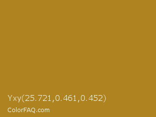 Yxy 25.721,0.461,0.452 Color is a normal orange color and the nearest color is University Of California Gold #b78727. Hex code #af8420 and RGB value is rgb(175,132,32). In RGB color space, this color is composed of 69% red, 52% green, 13% blue, In CMYK color space, this color is composed of 0% cyan, 25% magenta, 82% yellow , 31% black , In HSL color space, this color has a hue angle of 42° , 69% saturation and 41% lightness.