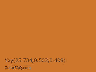 Yxy 25.734,0.503,0.408 Color is a normal orange color and the nearest color is Ochre #cc7722. Hex code #cc752b and RGB value is rgb(204,117,43). In RGB color space, this color is composed of 80% red, 46% green, 17% blue, In CMYK color space, this color is composed of 0% cyan, 43% magenta, 79% yellow , 20% black , In HSL color space, this color has a hue angle of 28° , 65% saturation and 48% lightness.