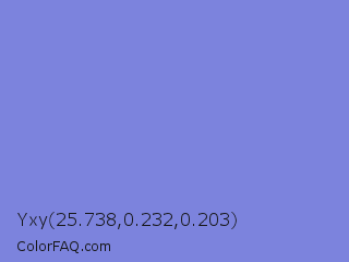 Yxy 25.738,0.232,0.203 Color is a light blue color and the nearest color is Chetwode Blue #8581d9. Hex code #7c83dd and RGB value is rgb(124,131,221). In RGB color space, this color is composed of 49% red, 51% green, 87% blue, In CMYK color space, this color is composed of 44% cyan, 41% magenta, 0% yellow , 13% black , In HSL color space, this color has a hue angle of 236° , 59% saturation and 68% lightness.