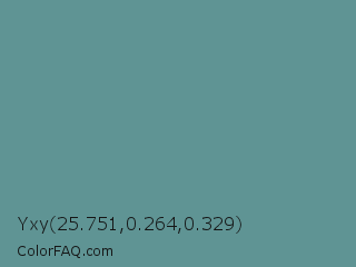 Yxy 25.751,0.264,0.329 Color is a normal cyan color and the nearest color is Patina #639a8f. Hex code #5f9494 and RGB value is rgb(95,148,148). In RGB color space, this color is composed of 37% red, 58% green, 58% blue, In CMYK color space, this color is composed of 36% cyan, 0% magenta, 0% yellow , 42% black , In HSL color space, this color has a hue angle of 180° , 22% saturation and 48% lightness.