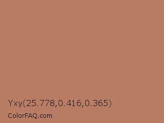 Yxy 25.778,0.416,0.365 Color is a normal orange color and the nearest color is Deer #ba8759. Hex code #b87d64 and RGB value is rgb(184,125,100). In RGB color space, this color is composed of 72% red, 49% green, 39% blue, In CMYK color space, this color is composed of 0% cyan, 32% magenta, 46% yellow , 28% black , In HSL color space, this color has a hue angle of 18° , 37% saturation and 56% lightness.