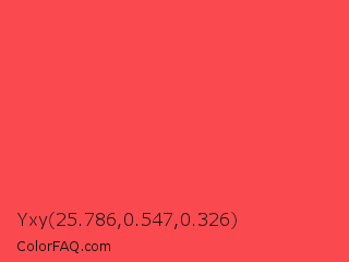 Yxy 25.786,0.547,0.326 Color is a light red color and the nearest color is Tart Orange #fb4d46. Hex code #fa4a4f and RGB value is rgb(250,74,79). In RGB color space, this color is composed of 98% red, 29% green, 31% blue, In CMYK color space, this color is composed of 0% cyan, 70% magenta, 68% yellow , 2% black , In HSL color space, this color has a hue angle of 358° , 95% saturation and 64% lightness.