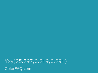 Yxy 25.797,0.219,0.291 Color is a normal cyan color and the nearest color is Eastern Blue #1e9ab0. Hex code #2298ad and RGB value is rgb(34,152,173). In RGB color space, this color is composed of 13% red, 60% green, 68% blue, In CMYK color space, this color is composed of 80% cyan, 12% magenta, 0% yellow , 32% black , In HSL color space, this color has a hue angle of 189° , 67% saturation and 41% lightness.