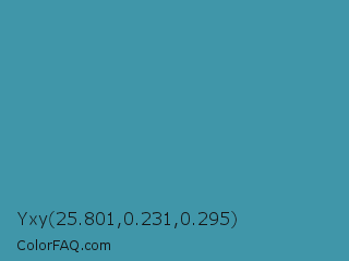 Yxy 25.801,0.231,0.295 Color is a normal cyan color and the nearest color is Boston Blue #3b91b4. Hex code #4096a9 and RGB value is rgb(64,150,169). In RGB color space, this color is composed of 25% red, 59% green, 66% blue, In CMYK color space, this color is composed of 62% cyan, 11% magenta, 0% yellow , 34% black , In HSL color space, this color has a hue angle of 191° , 45% saturation and 46% lightness.