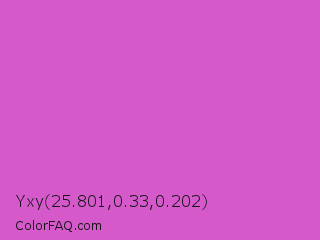 Yxy 25.801,0.33,0.202 Color is a normal magenta color and the nearest color is Fuchsia Pink #c154c1. Hex code #d659cc and RGB value is rgb(214,89,204). In RGB color space, this color is composed of 84% red, 35% green, 80% blue, In CMYK color space, this color is composed of 0% cyan, 58% magenta, 5% yellow , 16% black , In HSL color space, this color has a hue angle of 305° , 60% saturation and 59% lightness.