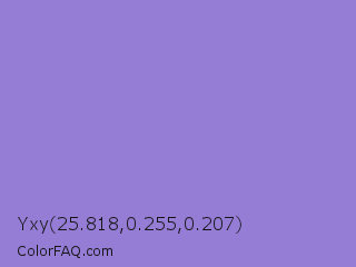 Yxy 25.818,0.255,0.207 Color is a light indigo color and the nearest color is Lilac Bush #9874d3. Hex code #957dd6 and RGB value is rgb(149,125,214). In RGB color space, this color is composed of 58% red, 49% green, 84% blue, In CMYK color space, this color is composed of 30% cyan, 42% magenta, 0% yellow , 16% black , In HSL color space, this color has a hue angle of 256° , 52% saturation and 66% lightness.