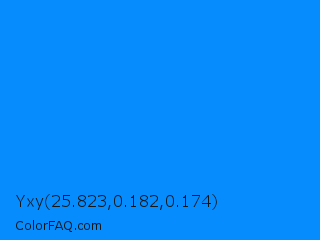 Yxy 25.823,0.182,0.174 Color is a normal blue color and the nearest color is Azure Radiance #007fff. Hex code #068cfc and RGB value is rgb(6,140,252). In RGB color space, this color is composed of 2% red, 55% green, 99% blue, In CMYK color space, this color is composed of 98% cyan, 44% magenta, 0% yellow , 1% black , In HSL color space, this color has a hue angle of 207° , 98% saturation and 51% lightness.