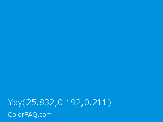Yxy 25.832,0.192,0.211 Color is a normal blue color and the nearest color is Rich Electric Blue #0892d0. Hex code #0192de and RGB value is rgb(1,146,222). In RGB color space, this color is composed of 0% red, 57% green, 87% blue, In CMYK color space, this color is composed of 100% cyan, 34% magenta, 0% yellow , 13% black , In HSL color space, this color has a hue angle of 201° , 99% saturation and 44% lightness.
