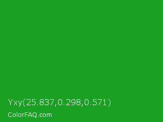 Yxy 25.837,0.298,0.571 Color is a normal green color and the nearest color is Slimy Green #299617. Hex code #1aa124 and RGB value is rgb(26,161,36). In RGB color space, this color is composed of 10% red, 63% green, 14% blue, In CMYK color space, this color is composed of 84% cyan, 0% magenta, 78% yellow , 37% black , In HSL color space, this color has a hue angle of 124° , 72% saturation and 37% lightness.