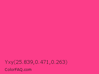 Yxy 25.839,0.471,0.263 Color is a light rose color and the nearest color is French Fuchsia #fd3f92. Hex code #fc3d89 and RGB value is rgb(252,61,137). In RGB color space, this color is composed of 99% red, 24% green, 54% blue, In CMYK color space, this color is composed of 0% cyan, 76% magenta, 46% yellow , 1% black , In HSL color space, this color has a hue angle of 336° , 97% saturation and 61% lightness.