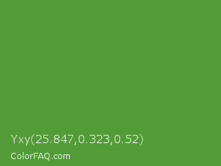 Yxy 25.847,0.323,0.52 Color is a normal green color and the nearest color is Apple #4fa83d. Hex code #529c37 and RGB value is rgb(82,156,55). In RGB color space, this color is composed of 32% red, 61% green, 22% blue, In CMYK color space, this color is composed of 47% cyan, 0% magenta, 65% yellow , 39% black , In HSL color space, this color has a hue angle of 104° , 48% saturation and 41% lightness.