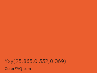 Yxy 25.865,0.552,0.369 Color is a normal color and the nearest color is Deep Carrot Orange #e9692c. Hex code #eb5e2e and RGB value is rgb(235,94,46). In RGB color space, this color is composed of 92% red, 37% green, 18% blue, In CMYK color space, this color is composed of 0% cyan, 60% magenta, 80% yellow , 8% black , In HSL color space, this color has a hue angle of 15° , 83% saturation and 55% lightness.