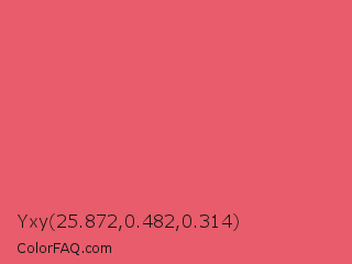 Yxy 25.872,0.482,0.314 Color is a light red color and the nearest color is Mandy #e25465. Hex code #e85c6b and RGB value is rgb(232,92,107). In RGB color space, this color is composed of 91% red, 36% green, 42% blue, In CMYK color space, this color is composed of 0% cyan, 60% magenta, 54% yellow , 9% black , In HSL color space, this color has a hue angle of 354° , 75% saturation and 64% lightness.