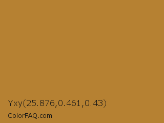 Yxy 25.876,0.461,0.43 Color is a normal orange color and the nearest color is University Of California Gold #b78727. Hex code #b68132 and RGB value is rgb(182,129,50). In RGB color space, this color is composed of 71% red, 51% green, 20% blue, In CMYK color space, this color is composed of 0% cyan, 29% magenta, 73% yellow , 29% black , In HSL color space, this color has a hue angle of 36° , 57% saturation and 45% lightness.