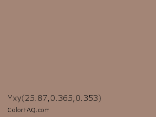 Yxy 25.87,0.365,0.353 Color is a normal orange color and the nearest color is Pharlap #a3807b. Hex code #a38576 and RGB value is rgb(163,133,118). In RGB color space, this color is composed of 64% red, 52% green, 46% blue, In CMYK color space, this color is composed of 0% cyan, 18% magenta, 28% yellow , 36% black , In HSL color space, this color has a hue angle of 20° , 20% saturation and 55% lightness.