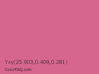 Yxy 25.903,0.409,0.281 Color is a light rose color and the nearest color is Pale Red Violet #db7093. Hex code #d7668e and RGB value is rgb(215,102,142). In RGB color space, this color is composed of 84% red, 40% green, 56% blue, In CMYK color space, this color is composed of 0% cyan, 53% magenta, 34% yellow , 16% black , In HSL color space, this color has a hue angle of 339° , 59% saturation and 62% lightness.