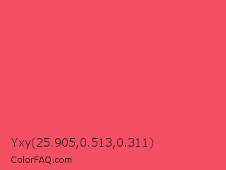 Yxy 25.905,0.513,0.311 Color is a light red color and the nearest color is Carnation #f95a61. Hex code #f54f63 and RGB value is rgb(245,79,99). In RGB color space, this color is composed of 96% red, 31% green, 39% blue, In CMYK color space, this color is composed of 0% cyan, 68% magenta, 60% yellow , 4% black , In HSL color space, this color has a hue angle of 353° , 89% saturation and 64% lightness.