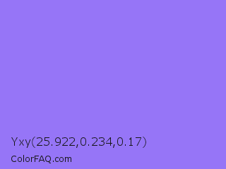 Yxy 25.922,0.234,0.17 Color is a light indigo color and the nearest color is Medium Purple #9370db. Hex code #9675f7 and RGB value is rgb(150,117,247). In RGB color space, this color is composed of 59% red, 46% green, 97% blue, In CMYK color space, this color is composed of 39% cyan, 53% magenta, 0% yellow , 3% black , In HSL color space, this color has a hue angle of 255° , 89% saturation and 71% lightness.
