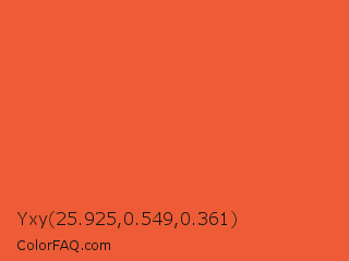 Yxy 25.925,0.549,0.361 Color is a normal red color and the nearest color is Flamingo #f2552a. Hex code #ed5c36 and RGB value is rgb(237,92,54). In RGB color space, this color is composed of 93% red, 36% green, 21% blue, In CMYK color space, this color is composed of 0% cyan, 61% magenta, 77% yellow , 7% black , In HSL color space, this color has a hue angle of 12° , 84% saturation and 57% lightness.