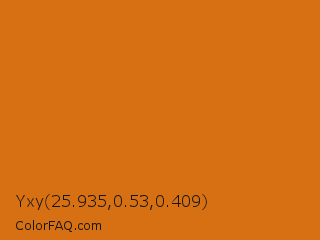 Yxy 25.935,0.53,0.409 Color is a normal orange color and the nearest color is Hot Cinnamon #d2691e. Hex code #d67013 and RGB value is rgb(214,112,19). In RGB color space, this color is composed of 84% red, 44% green, 7% blue, In CMYK color space, this color is composed of 0% cyan, 48% magenta, 91% yellow , 16% black , In HSL color space, this color has a hue angle of 29° , 84% saturation and 46% lightness.