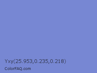 Yxy 25.953,0.235,0.218 Color is a light blue color and the nearest color is Chetwode Blue #8581d9. Hex code #7787d3 and RGB value is rgb(119,135,211). In RGB color space, this color is composed of 47% red, 53% green, 83% blue, In CMYK color space, this color is composed of 44% cyan, 36% magenta, 0% yellow , 17% black , In HSL color space, this color has a hue angle of 230° , 51% saturation and 65% lightness.