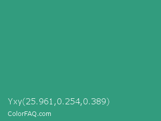 Yxy 25.961,0.254,0.389 Color is a normal green color and the nearest color is Illuminating Emerald #319177. Hex code #329c7e and RGB value is rgb(50,156,126). In RGB color space, this color is composed of 20% red, 61% green, 49% blue, In CMYK color space, this color is composed of 68% cyan, 0% magenta, 19% yellow , 39% black , In HSL color space, this color has a hue angle of 163° , 51% saturation and 40% lightness.
