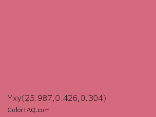 Yxy 25.987,0.426,0.304 Color is a light red color and the nearest color is Cinnamon Satin #cd607e. Hex code #d56a7f and RGB value is rgb(213,106,127). In RGB color space, this color is composed of 84% red, 42% green, 50% blue, In CMYK color space, this color is composed of 0% cyan, 50% magenta, 40% yellow , 16% black , In HSL color space, this color has a hue angle of 348° , 56% saturation and 63% lightness.