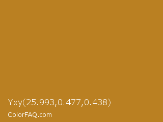 Yxy 25.993,0.477,0.438 Color is a normal orange color and the nearest color is University Of California Gold #b78727. Hex code #ba8022 and RGB value is rgb(186,128,34). In RGB color space, this color is composed of 73% red, 50% green, 13% blue, In CMYK color space, this color is composed of 0% cyan, 31% magenta, 82% yellow , 27% black , In HSL color space, this color has a hue angle of 37° , 69% saturation and 43% lightness.