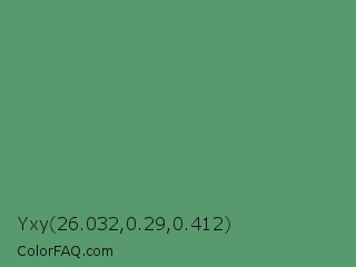 Yxy 26.032,0.29,0.412 Color is a normal green color and the nearest color is Russian Green #679267. Hex code #59996e and RGB value is rgb(89,153,110). In RGB color space, this color is composed of 35% red, 60% green, 43% blue, In CMYK color space, this color is composed of 42% cyan, 0% magenta, 28% yellow , 40% black , In HSL color space, this color has a hue angle of 140° , 26% saturation and 47% lightness.