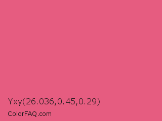 Yxy 26.036,0.45,0.29 Color is a light rose color and the nearest color is Dark Pink #e75480. Hex code #e65c80 and RGB value is rgb(230,92,128). In RGB color space, this color is composed of 90% red, 36% green, 50% blue, In CMYK color space, this color is composed of 0% cyan, 60% magenta, 44% yellow , 10% black , In HSL color space, this color has a hue angle of 344° , 73% saturation and 63% lightness.