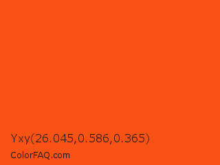 Yxy 26.045,0.586,0.365 Color is a normal orange color and the nearest color is Orioles Orange #fb4f14. Hex code #f85214 and RGB value is rgb(248,82,20). In RGB color space, this color is composed of 97% red, 32% green, 8% blue, In CMYK color space, this color is composed of 0% cyan, 67% magenta, 92% yellow , 3% black , In HSL color space, this color has a hue angle of 16° , 94% saturation and 53% lightness.
