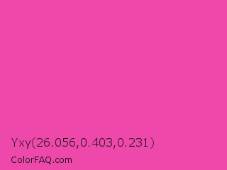 Yxy 26.056,0.403,0.231 Color is a light magenta color and the nearest color is Brilliant Rose #f653a6. Hex code #ef48ab and RGB value is rgb(239,72,171). In RGB color space, this color is composed of 94% red, 28% green, 67% blue, In CMYK color space, this color is composed of 0% cyan, 70% magenta, 28% yellow , 6% black , In HSL color space, this color has a hue angle of 324° , 84% saturation and 61% lightness.