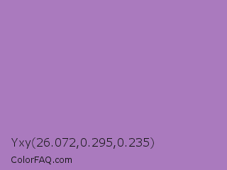 Yxy 26.072,0.295,0.235 Color is a light purple color and the nearest color is African Violet #b284be. Hex code #aa7abe and RGB value is rgb(170,122,190). In RGB color space, this color is composed of 67% red, 48% green, 75% blue, In CMYK color space, this color is composed of 11% cyan, 36% magenta, 0% yellow , 25% black , In HSL color space, this color has a hue angle of 282° , 34% saturation and 61% lightness.
