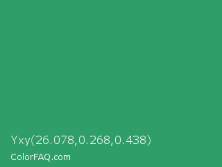 Yxy 26.078,0.268,0.438 Color is a normal green color and the nearest color is Illuminating Emerald #319177. Hex code #2f9e69 and RGB value is rgb(47,158,105). In RGB color space, this color is composed of 18% red, 62% green, 41% blue, In CMYK color space, this color is composed of 70% cyan, 0% magenta, 34% yellow , 38% black , In HSL color space, this color has a hue angle of 151° , 54% saturation and 40% lightness.