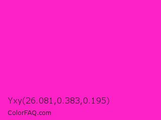Yxy 26.081,0.383,0.195 Color is a normal magenta color and the nearest color is Hot Magenta #ff1dce. Hex code #fc22c7 and RGB value is rgb(252,34,199). In RGB color space, this color is composed of 99% red, 13% green, 78% blue, In CMYK color space, this color is composed of 0% cyan, 87% magenta, 21% yellow , 1% black , In HSL color space, this color has a hue angle of 315° , 97% saturation and 56% lightness.