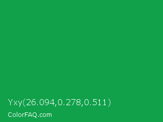 Yxy 26.094,0.278,0.511 Color is a normal green color and the nearest color is Green Pigment #00a550. Hex code #10a14a and RGB value is rgb(16,161,74). In RGB color space, this color is composed of 6% red, 63% green, 29% blue, In CMYK color space, this color is composed of 90% cyan, 0% magenta, 54% yellow , 37% black , In HSL color space, this color has a hue angle of 144° , 82% saturation and 35% lightness.