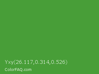 Yxy 26.117,0.314,0.526 Color is a normal green color and the nearest color is Apple #4fa83d. Hex code #489e38 and RGB value is rgb(72,158,56). In RGB color space, this color is composed of 28% red, 62% green, 22% blue, In CMYK color space, this color is composed of 54% cyan, 0% magenta, 65% yellow , 38% black , In HSL color space, this color has a hue angle of 111° , 48% saturation and 42% lightness.