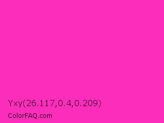 Yxy 26.117,0.4,0.209 Color is a normal magenta color and the nearest color is Razzle Dazzle Rose #ff33cc. Hex code #fc2dba and RGB value is rgb(252,45,186). In RGB color space, this color is composed of 99% red, 18% green, 73% blue, In CMYK color space, this color is composed of 0% cyan, 82% magenta, 26% yellow , 1% black , In HSL color space, this color has a hue angle of 319° , 97% saturation and 58% lightness.