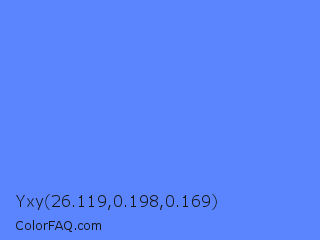 Yxy 26.119,0.198,0.169 Color is a light blue color and the nearest color is Blueberry #4f86f7. Hex code #5a85ff and RGB value is rgb(90,133,255). In RGB color space, this color is composed of 35% red, 52% green, 100% blue, In CMYK color space, this color is composed of 65% cyan, 48% magenta, 0% yellow , 0% black , In HSL color space, this color has a hue angle of 224° , 100% saturation and 68% lightness.
