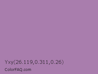 Yxy 26.119,0.311,0.26 Color is a normal magenta color and the nearest color is Bouquet #ae809e. Hex code #a97dad and RGB value is rgb(169,125,173). In RGB color space, this color is composed of 66% red, 49% green, 68% blue, In CMYK color space, this color is composed of 2% cyan, 28% magenta, 0% yellow , 32% black , In HSL color space, this color has a hue angle of 295° , 23% saturation and 58% lightness.