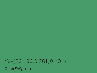 Yxy 26.136,0.281,0.431 Color is a normal green color and the nearest color is Fruit Salad #4f9d5d. Hex code #479c69 and RGB value is rgb(71,156,105). In RGB color space, this color is composed of 28% red, 61% green, 41% blue, In CMYK color space, this color is composed of 54% cyan, 0% magenta, 33% yellow , 39% black , In HSL color space, this color has a hue angle of 144° , 37% saturation and 45% lightness.