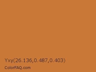 Yxy 26.136,0.487,0.403 Color is a normal orange color and the nearest color is Bronze #cd7f32. Hex code #c97838 and RGB value is rgb(201,120,56). In RGB color space, this color is composed of 79% red, 47% green, 22% blue, In CMYK color space, this color is composed of 0% cyan, 40% magenta, 72% yellow , 21% black , In HSL color space, this color has a hue angle of 26° , 57% saturation and 50% lightness.