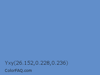 Yxy 26.152,0.228,0.236 Color is a normal blue color and the nearest color is Danube #6093d1. Hex code #618eca and RGB value is rgb(97,142,202). In RGB color space, this color is composed of 38% red, 56% green, 79% blue, In CMYK color space, this color is composed of 52% cyan, 30% magenta, 0% yellow , 21% black , In HSL color space, this color has a hue angle of 214° , 50% saturation and 59% lightness.