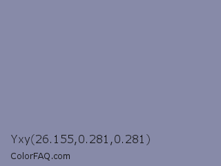 Yxy 26.155,0.281,0.281 Color is a normal blue color and the nearest color is Cool Grey #8c92ac. Hex code #878aa8 and RGB value is rgb(135,138,168). In RGB color space, this color is composed of 53% red, 54% green, 66% blue, In CMYK color space, this color is composed of 20% cyan, 18% magenta, 0% yellow , 34% black , In HSL color space, this color has a hue angle of 235° , 16% saturation and 59% lightness.