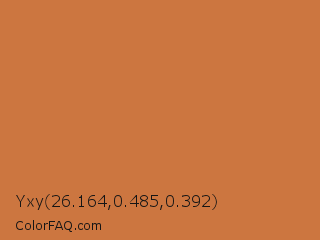 Yxy 26.164,0.485,0.392 Color is a normal orange color and the nearest color is Raw Sienna Crayola #d27d46. Hex code #cc7640 and RGB value is rgb(204,118,64). In RGB color space, this color is composed of 80% red, 46% green, 25% blue, In CMYK color space, this color is composed of 0% cyan, 42% magenta, 69% yellow , 20% black , In HSL color space, this color has a hue angle of 23° , 58% saturation and 53% lightness.