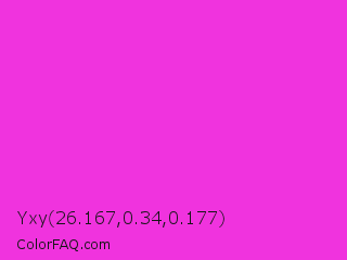 Yxy 26.167,0.34,0.177 Color is a normal magenta color and the nearest color is Razzle Dazzle Rose #ff33cc. Hex code #f033de and RGB value is rgb(240,51,222). In RGB color space, this color is composed of 94% red, 20% green, 87% blue, In CMYK color space, this color is composed of 0% cyan, 79% magenta, 8% yellow , 6% black , In HSL color space, this color has a hue angle of 306° , 86% saturation and 57% lightness.