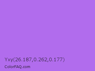 Yxy 26.187,0.262,0.177 Color is a light purple color and the nearest color is Lavender #b57edc. Hex code #b16ced and RGB value is rgb(177,108,237). In RGB color space, this color is composed of 69% red, 42% green, 93% blue, In CMYK color space, this color is composed of 25% cyan, 54% magenta, 0% yellow , 7% black , In HSL color space, this color has a hue angle of 272° , 78% saturation and 68% lightness.