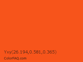 Yxy 26.194,0.581,0.365 Color is a normal orange color and the nearest color is Giants Orange #fe5a1d. Hex code #f7541b and RGB value is rgb(247,84,27). In RGB color space, this color is composed of 97% red, 33% green, 11% blue, In CMYK color space, this color is composed of 0% cyan, 66% magenta, 89% yellow , 3% black , In HSL color space, this color has a hue angle of 16° , 93% saturation and 54% lightness.